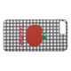 Teacher's iPhone 7 case in a black and white gingham pattern. Graphics of a plaid red apple, decorates the middle of the case, with red text below reading Teacher. Personalize the text to read what you want.