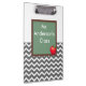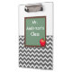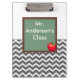 Keep organized in style with a Personalized Teachers Gray Chevron Chalkboard custom clipboard which features a Gray Chevron Chalkboard pattern with a chalkboard and apple. The Chalkboard currently says Mr. Anderson's Class. Personalize with your name or any text you'd like. If you need help customizing this product, please contact me through my store and I'll be happy to help! Many matching products are also available in our shop. Printed on two sides. Holds up to ½” paper securely.