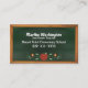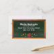 Stylish school teacher's business card, with fun graphics of an old fashioned blackboard in a wooden frame. Cute country style graphics of an apple and vine decoration on the bottom front. White text on the blackboard is ready to personalize. Parent / teacher conference space, on the reverse side of the card is done in black on a white background. Nice business card template for teachers and tutors.