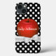Pretty iPhone case with graphics of a small flower pattern on juicy red, against a black and white polka dot background. Graphics of a white ribbon and bow runs across the bottom of the apple. Personalize the white text. Great for yourself or as a gift idea for your favorite teacher.