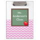 Keep organized in style with a Personalized Teachers Pink Chevron Chalkboard custom clipboard which features a Pink Chevron Chalkboard pattern with a chalkboard and apple. The Chalkboard currently says Ms. Anderson's Class. Personalize with your name or any text you'd like. If you need help customizing this product, please contact me through my store and I'll be happy to help! Many matching products are also available in our shop. Printed on two sides. Holds up to ½” paper securely.