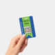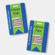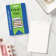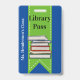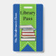 Fun school library hall pass done in blue with a green ribbon, running down the middle, with graphics of a stack of books. Personalize the custom text to read what you want.