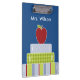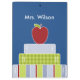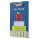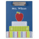 Teacher's clipboard, with colorful graphics of a stack of books and an apple, on top, against a blue background. Personalize the white text for a great teacher's gift idea.