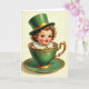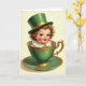 This card shows a doll-like child rising from an emerald-green teacup, gazing outward with luminous green eyes and rosy cheeks that feel like a friendly, inviting hello 💚. Golden-brown curls frame the cherubic face, and a green top hat with a gold band sits neatly on top, adding a sweet, dressed-up touch. The deep green cup and matching saucer are trimmed with ornate gold flourishes, and the warm highlights make the metal-like details glint softly ☘️. A tiny gold bauble rests at the child’s throat above a crisp white ruffled collar, as if someone carefully fastened it with affection. The background stays gentle and light, letting the rich greens and gold accents stand out without distraction. Across the upper area, the St. Patrick’s Day greeting is set in gold lettering, while a smaller line of text sits near the bottom in a softer green. The teacup’s rim curves around the child’s shoulders, and the saucer beneath shows scrolling gold patterns that mirror the hatband.