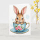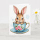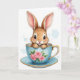 Designed with a fluffy long-eared bunny 🐰 peeking out of an elegant teacup, this card centers on warm brown fur with careful texture and a sweet, bashful expression. Its large dark eyes glance upward as if meeting a friend’s gaze, with a small pink nose, rosy cheeks, and fine whiskers adding a gentle, affectionate look. Tiny paws rest on the cup’s rim, suggesting a shy little hello. The teacup and saucer are a soft robin’s egg blue with thin gold edging along the lip, base, and curved handle. A cluster of soft pink roses with green leaves decorates the cup, giving the scene a romantic, garden-like touch 🌷. A short Easter greeting sits near the top in a light pastel tone, with a smaller line of text near the bottom in matching color. The background stays white with faint pale-blue cloud shapes drifting behind the cup.