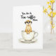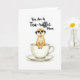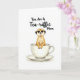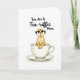 This greeting card features a small, friendly cartoon animal peeking out from a white teacup, creating a cozy, affectionate moment ❤️. Set on a bright white background, the little creature has sandy-brown and light tan fur with darker markings around its eyes that give it a tender, attentive look, as if it’s waiting to be noticed. Its tiny paws rest on the rim of the cup, adding a gentle, cuddly touch like a quiet nudge between close friends. The cup has a simple handle and sits on a matching saucer, with soft gray shading that suggests smooth ceramic and a calm tabletop shadow. Above the illustration, a short pun-style message is placed near the top center in thin, dark lettering that feels casual and friendly. The open white space around the drawing keeps the focus on the warm fur tones and the inviting cup, making the scene feel light and sweet 🌼. Subtle gray shadows fall beneath the saucer, and the teacup’s curved rim is outlined with delicate shading.
