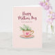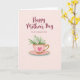Designed with a tall, vertical layout, the upper area features a flowing maroon greeting in large lettering, with a smaller, simple line just beneath it naming the family recipient. Centered below the words sits a pastel pink teacup and saucer, drawn with soft shading that feels gentle and intimate. Thin golden details trace the cup’s rim and curved handle, and a textured heart on the front seems to glow with a quiet, affectionate warmth ❤️. The saucer matches in pale pink and carries a scalloped golden edge that adds a dressy touch without feeling fussy. From the cup spills a full bouquet of small white spring blossoms, tucked among fresh green leaves and a few tiny bell-shaped flowers 🌼. The background stays light and uncluttered, letting the tender pairing of heart motif and shared-tea imagery suggest closeness like a friendly chat or a loving pause. The white flowers fan upward above the cup, with green stems and leaves layered in soft, watercolor-like washes against the pale backdrop.