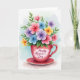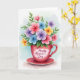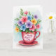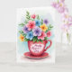 Designed with a soft watercolor look, the artwork centers on a classic teacup holding a full bouquet that feels like a sweet gesture between close friends ❤️. Flowers in gentle pink, calm blue, quiet purple, and sunny yellow-orange crowd together, with leafy greens curling around them like an affectionate embrace. The teacup is a coral-pink tone with a curved handle, sitting neatly on a matching saucer. A thin golden edge traces the saucer rim, adding a small touch of shine without stealing attention. On the front of the cup, a short message appears in deep magenta lettering, set over a pale pink brushstroke highlight so the words stand out. The text sits centered on the cup’s belly, balanced by the bouquet rising above it. Behind everything, a light blue and white wash spreads outward like a soft morning sky, keeping the focus on the flowers 🌼. The background fades gently at the edges, with the strongest color staying around the cup and saucer.