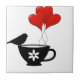 Whimsical graphic features teacup and finch silhouette with red heart balloons.