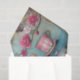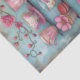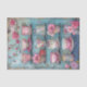 This decoupage tissue paper design features teacups on a display shelf with cupcakes and flowers. Artwork is by