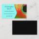 Guitar lessons business card, with an abstract guitar image filled with red and green colors on a teal background. Black lettering allows you to customize with your own information. The back is black to complement the colors on the front. Great for advertising and networking your musical business.
