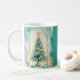 An elegant Christmas mug showcasing a beautifully decorated tree with teal ornaments and glowing golden candles. The serene teal background evokes a calm and cozy festive atmosphere. Ideal for elegant holiday decor or as a thoughtful Christmas gift. A perfect match for anyone who loves sophisticated and peaceful Christmas designs.