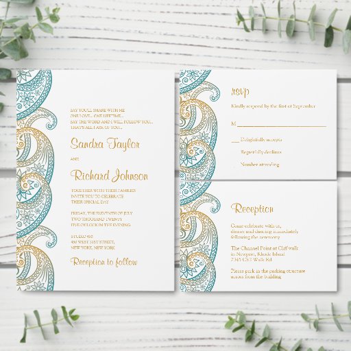 Indian Wedding Invitations Paisley, Teal and GoldDesigned by Galina Ivanova