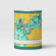 Wedding Pillar Candle with with floral patterns, teal colored flowers with golden foil streaks and rust and yellow gold foil paper background. Beautiful artistic floral Wedding Pillar Candle. Vintage watercolor Wedding Pillar Candle. Teal and Golden Collection.