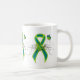 The teal and lime green ribbon with a butterfly, concentric circles, and swishes.. This ribbons stands for Pulmonary Fibrosis. Pulmonary Fibrosis Awareness is in September.