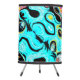 A bright teal lampshade, laced with gold and black and pink swirls and ripples.
