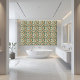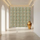 This tile features a repeating pattern of teal paw prints and tan animal silhouettes on a light peach background. This playful design is perfect for adding a touch of fun to any space, especially for pet lovers. The seamless pattern makes it ideal for creating a continuous design across multiple tiles.