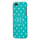 A custom monogram design in teal and white. The initial letter can be customized. The background is a polka dot pattern in teal and white.