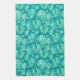 Kitchen towel in a pattern of teal, turquoise, white and aqua semi-abstract sea shells on a turquoise background