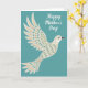 This card shows a graceful bird gliding mid-flight across a deep teal background, outlined in crisp white so it stands out clearly. Its wings and body are filled with delicate floral shapes, soft chevrons, and flowing organic patterns that feel like a quiet love letter in motion ❤️. Muted creams, pale aqua, warm beige, and small touches of rust-brown drift across the feathers, giving the bird a tender, cared-for look. Each feather carries its own tiny pattern, like stitched fabric or careful body art, inviting you to linger on the details. The open space around the bird keeps the scene calm, like a private moment shared between close friends. In the upper right area, a flowing white message sits lightly on the teal, balanced so it doesn’t crowd the bird 🌼. The lettering is angled gently and placed high, leaving the bird centered and unobstructed against the solid background. The teal field stays smooth and uninterrupted, with the patterned bird as the only detailed focal point.