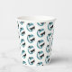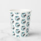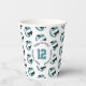 These volleyball themed birthday party paper cups feature multiple small teal, black & white volleyballs arranged in a simple drop pattern - text on a white circle graphic can be customized, currently the number 12 to represent a child's age encircled by the words, "Happy birthday" - by katz_d_zynes