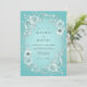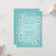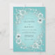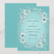 This design features a soft teal background with a delicate wreath of light blue and silver-toned flowers and foliage. The romantic floral arrangement creates an ethereal and elegant feel, perfect for a special occasion.