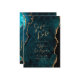 This elegant wedding save the date features a background image of teal blue watercolor agate trimmed with faux gold glitter. The customizable text combines gold-colored modern handwriting, copperplate and italic fonts. The reverse side features a coordinating teal and gold agate design.