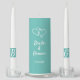 Personalized teal blue and white design with custom name initial letters and date of marriage.