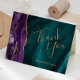 This elegant modern wedding thank you card features a purple watercolor agate border trimmed with faux gold glitter. The customizable text combines the words "Thank You" in gold-colored handwriting script and the names of the bride and groom in italic font on a teal watercolor agate background.