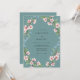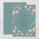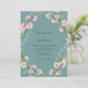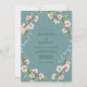 This design features a muted teal blue backdrop adorned with delicate pink cherry blossoms and tiny blue forget-me-nots. The watercolor style creates a romantic and serene atmosphere perfect for a spring event. Soft green leaves weave through the botanical arrangement, offering a fresh and airy feel.
