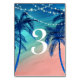 Are your tropical wedding theme colors teal blue and peach? Here are some unique, tropical table number cards that will complement your ocean beach destination wedding beautifully! This elegant watercolor design illustrates blue palm tree silhouettes along with romantic strings of lights. Category: tropical wedding table numbers; palm tree table number card template; beach theme wedding ideas. Colors: teal blue, peach, pink, aqua and sea green.