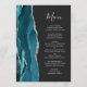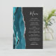 The left-hand edge of this elegant modern wedding menu features a teal blue watercolor agate border trimmed with faux silver glitter. The customizable text combines silver gray handwriting script and copperplate fonts on an off-black background. The reverse side features a matching teal and silver agate design.
