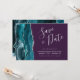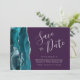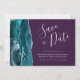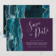 This elegant modern save the date card features a teal blue watercolor agate border trimmed with faux silver glitter. The customizable text combines silver gray handwriting script, copperplate and italic fonts on a purple background. The reverse side features a matching teal and silver agate design.