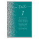 The left-hand edge of this elegant modern wedding table number card features a silver faux glitter border. The word "table" appears in silver gray whimsical handwriting script on a teal blue background. Add the names of your guests who are assigned to each table.