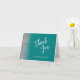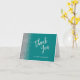 This elegant modern wedding thank you card features a border of silver faux glitter on a teal blue background. The customizable text combines the words "Thank You" in silver gray handwriting script and the names of the bride and groom in sans serif font.