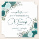 This wedding coaster is elegant, stylish, and fun! It features a beautiful boho chic floral design with hand painted watercolor roses in shades of teal, turquoise, and aqua, along with garden eucalyptus leaves and foliage. The text is written in elegant modern script lettering and reads "Please don't take my drink, I'm dancing" with space for the names of the couple and wedding date at the bottom. Great memento for your guests and also a practical way to let the wait staff know not to clear the drinks just yet!