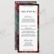 A teal blue jewel tone wedding dinner menu featuring a symphony of deep bordeaux raspberry red peonies embellished with gold spray and shimmering gold outlines gather around a deep teal blue watercolor wash background with your names in a gold rustic script.