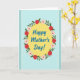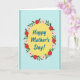 This card features a sunny yellow oval at the center, setting a cheerful stage for a Mother’s Day message that feels warm and close ❤️. Inside the oval, the main text sits centered in deep blue, with smooth, flowing lettering that stands out clearly against the yellow. Around it, a circular floral wreath frames the message like a gentle embrace, suggesting affection through its soft, balanced spacing. The wreath alternates rich red flowers with blush-pink blooms, each with a lighter center and fine outlines that add depth without feeling busy. Slender deep green leaves weave between the blossoms, creating a natural rhythm that hints at tenderness and care 🌼. The background is a light sky-blue wash that keeps the overall look calm and airy, letting the center design draw the eye. Along the left and right edges, muted teal vertical side bands appear with pale cream dotted lines running through them.