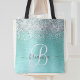 Teal Brushed Metal Silver Glitter Monogram Name Tote Bag