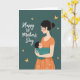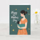 This Mother's Day card shows a calm illustration of a woman in profile holding a small baby close, her eyes gently closed as her face leans toward the child with a tender, protective closeness ❤️. The baby rests snugly against her chest in a teal wrap, adding to the quiet, affectionate mood in the scene. A deep, muted teal background sets a peaceful setting, while her warm orange dress creates a cozy contrast against the cooler tones. Along the lower edge of her dress, small white floral details add a soft decorative touch without distracting from the figures. Several small golden butterflies drift across the space, giving the moment a light, celebratory feel 🌼. The phrase “Happy 1st Mother’s Day” appears in white near the upper left, balanced by the figures placed slightly to the right. Warm rosy cheeks and the gentle shading around the faces stand out against the teal backdrop, with the butterflies scattered around them in simple golden shapes.