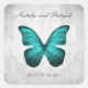 Elegant and simple Wedding sticker featuring a teal butterfly against a gray grunge background. This design is a unique choice for a modern wedding. Easy to customize with your wedding details. Click "Customize It" to find more personalization options.