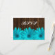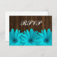 A country themed wedding RSVP card featuring teal blue daisies on a dark rustic brown barn wood background.