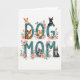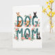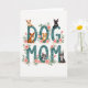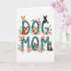 This card features the words “DOG MOM” centered in large teal letters sprinkled with tiny white dots, arranged across two lines. Blush-pink roses, small tulip buds, and curling green leaves weave around the lettering like a garden garland, with petals brushing the edges in a gentle, affectionate way ❤️. Several cute pups are tucked among the shapes, their wide eyes and relaxed smiles suggesting a cozy, loyal friendship with the viewer. One small black dog with a white chest sits atop the “G,” while a light brown, perky-eared dog peeks from the “D” as if posing for a photo. Other little dogs perch on curves, peek through open spaces, or sit beside the letters, creating tiny moments of closeness and shared attention. The background stays bright white, letting the soft pinks, greens, and teal stand out without crowding the scene 🌼. The teal title text sits in the middle, with flowers and pups clustered along the tops and sides of the letters, and white dotted accents scattered across each character.