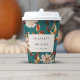 Teal Fall Paper Cups. Serve up drinks in seasonal style with these coordinating paper cups, designed with hand-painted autumn florals and leaves in shades of burnt orange, terracotta, cream, and copper, all set on a teal background. Perfect for coffee bars, cocktail hours, or dessert tables, these cups keep your event visually cohesive while adding charm to every sip. Customize them to match your wedding vibe from start to finish.