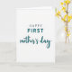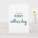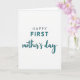 This Mother's Day card features a simple design set on a bright white background, with the focus placed entirely on the words and their gentle balance. The text reads “HAPPY FIRST mother’s day,” arranged in a centered layout that feels calm and caring, like a quiet hug ❤️. “HAPPY” appears in a dark charcoal, all-caps style near the top, keeping the opening line steady and easy to read. “FIRST” sits just below it in a larger teal color, giving that word extra emphasis without feeling heavy. The phrase “mother’s day” flows underneath in matching teal with a softer, curved lettering style that adds a tender, affectionate touch 🌼. A faint shadow under the teal letters gives the wording a slight lift from the page, adding depth while staying subtle. The overall look remains uncluttered, with generous white space surrounding the centered text and the teal lines standing out crisply against the white.