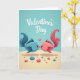 This card shows two stylized fish in teal-blue and coral-pink floating nose-to-nose as if leaning in for a kiss, with a tiny red heart glowing between them 🥰. The background fades through soft teal tones like calm underwater light, giving the scene a gentle, dreamy depth. Each fish has patterned scale textures and big, expressive eyes that linger on the other with sweet attention ❤️. Their fins and tails sweep outward in smooth curves, especially the pink fish’s tail that arcs like a ribbon in the water. Along the bottom, a sandy seabed appears with rounded pebbles scattered in matching blues and pinks. At the top center, the words “Valentine’s Day” sit like a header in a flowing cursive style, colored in a darker teal that stands out against the lighter water. Soft highlights and faint shadows add dimension around the fish bodies and the small heart. The composition is framed by open water around the pair, with the heart placed precisely in the narrow space between their noses.
