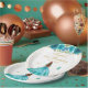 This elegant and glamorous birthday party plate features a beautiful princess with brown red hair and fair skin in a teal blue ball gown. The text combines handwritten script and modern sans serif fonts for a classy and sophisticated look. The floral arrangements, butterflies and gold confetti create the perfect blend of rustic and chic.