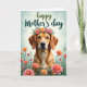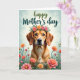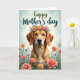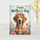 This card features a sweet-looking dog with golden-brown fur and amber eyes, gazing forward with a gentle, affectionate expression ❤️. A flower crown rests on its head, made of peach and rosy pink blooms with leafy green sprigs that feel like a thoughtful gift from a close friend. The dog is framed by a lush foreground filled with matching flowers and slender green stems, like a quiet meadow where kind moments linger. Behind it, a light teal sky-like background with soft, cloudy wisps keeps the scene calm and airy. Near the top, a celebratory message is printed in flowing green lettering, centered above the portrait so it reads clearly without crowding the art. The lighting is soft and diffused, bringing out the cozy texture of the fur and the velvety look of each petal 🌼. The flowers in front cluster along the lower edge, with pops of peach and pink rising on thin green stems.