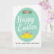 This design shows a tall pastel teal oval centered on a plain white background, giving the layout lots of open space and a calm spring look 🌷. Near the top of the oval, a large white greeting is written in flowing lettering, stretching across the upper portion as the main focal point. Just above the words, a curved garland of bright pink blossoms with small green leaves arches gently, like a soft crown. In the lower part of the oval, three glossy yellow egg shapes sit side by side in a neat row, close enough to feel like a little group. Each egg is topped with a tiny pink flower, and the repeated detail reads like a sweet, shared gesture between close friends 🐰. Beneath the eggs, a smaller line of dedication appears in dark brown, set in simple, easy-to-read lettering near the bottom of the teal shape. The pink blossoms are clustered along the top curve, while the three yellow eggs line up across the lower third of the oval.