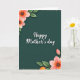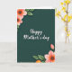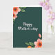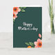 This card features a deep teal-green background that feels calm and intimate, like a quiet moment shared with someone you love ❤️. Centered on the front, the words “Happy Mother’s day” appear in flowing white lettering that stands out clearly against the dark field. Soft watercolor-style botanical clusters frame the message, with one arrangement in the upper left and another in the lower right, creating a gentle, caring balance. The main blossoms have coral-pink petals that fade into warmer orange-red near earthy brown centers, as if they’re leaning in close together. Around them, layered green leaves spill outward in varied tones, adding a cozy, gathered-around feeling like friends huddling for a photo 🌼. In the lower right, a small unopened pink bud sits near a round orange, fruit-like dot that adds a bright accent. A thin, irregular border line runs around the edge, punctuated by small metallic-toned circles that resemble tiny fasteners.